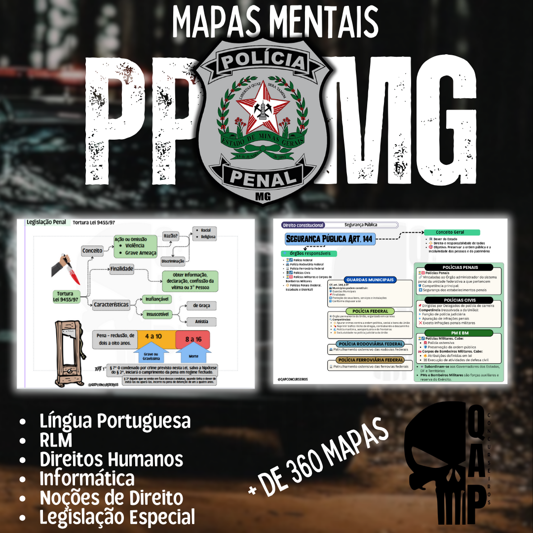 Se você quer ganhar tempo, memorizar mais rápido e chegar confiante na PP-MG, este combo de +360 Mapas Mentais foi feito para você. Tudo organizado por disciplina, com PDF interativo e versão para impressão, focado no que realmente cai no edital.